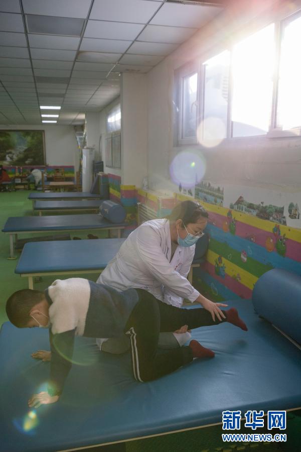 在哈爾濱博能中醫(yī)門診部,劉雨晴為腦癱兒童進(jìn)行康復(fù)訓(xùn)練(2月2日攝)。
