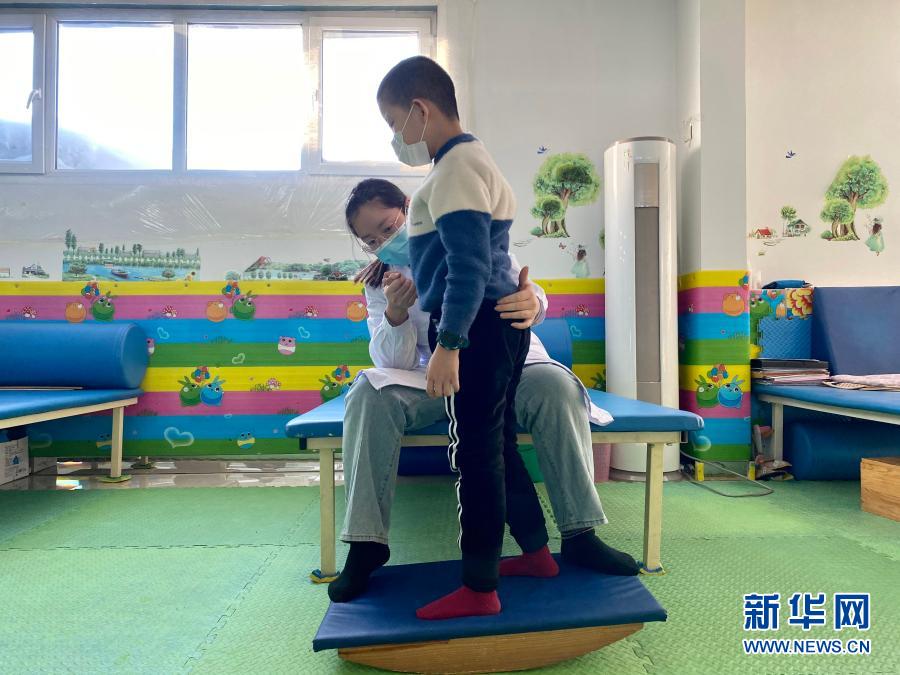 在哈爾濱博能中醫(yī)門(mén)診部,劉雨晴為腦癱兒童進(jìn)行康復(fù)訓(xùn)練(2月2日攝,手機(jī)照片)。