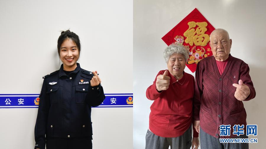 拼版照片:左圖為2月11日,楊曉惠在天津市紅橋區(qū)芥園派出所比心(孫凡越 攝),右圖為2月11日,在河北邯鄲居住的楊曉惠的爺爺與奶奶在家中比心(王洪超 攝)。新華社發(fā)
