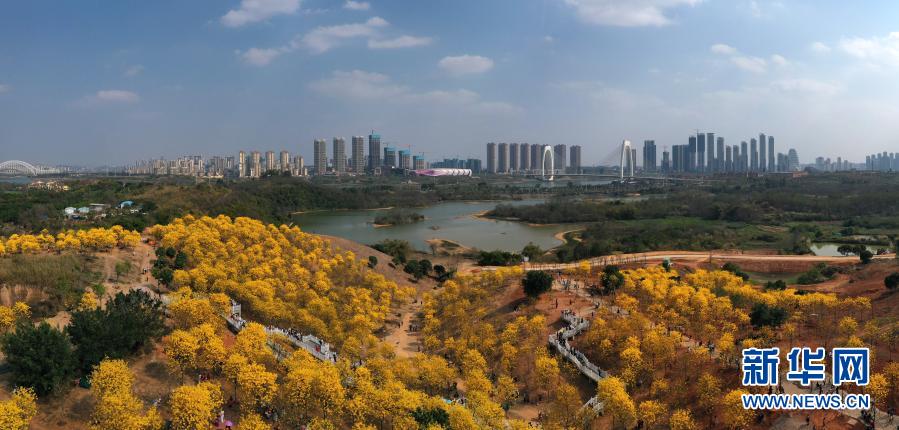 近日,廣西南寧市青秀山風(fēng)景區(qū)黃花風(fēng)鈴木盛放,吸引眾多游人前來觀賞。