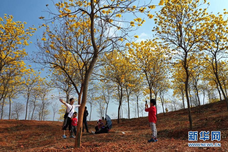 2月21日,游人在南寧市青秀山風(fēng)景區(qū)觀賞盛開的黃花風(fēng)鈴木。