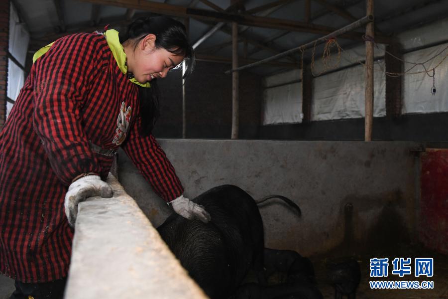 張志菊在自家農(nóng)場里的豬圈里喂豬(2月25日攝)。