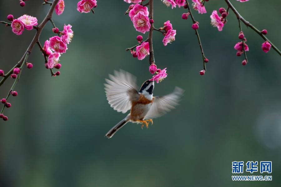 3月2日,在江蘇無錫管社山莊,小鳥在綻放的梅花下“親吻”花蕊。新華社發(fā)(潘正光 攝)