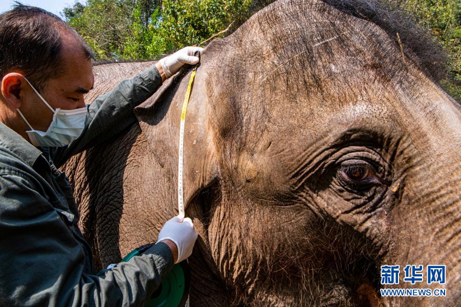 “象爸爸”為一頭名叫“小強(qiáng)”的大象檢查耳朵(3月6日攝)。新華社記者 江文耀 攝