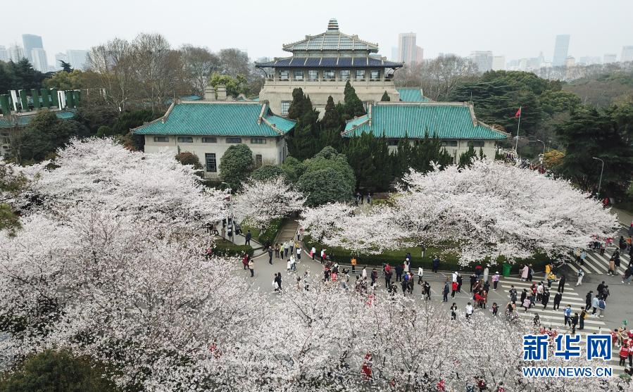 3月13日,來自各地的援鄂醫(yī)護(hù)人員在武漢大學(xué)校園共赴櫻花之約(無人機照片)。新華社記者 程敏 攝