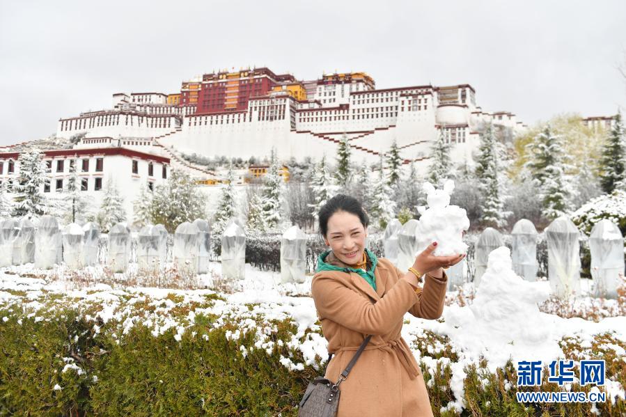 3月14日,在布達(dá)拉宮前,一名路人舉起一個(gè)雪人留影。