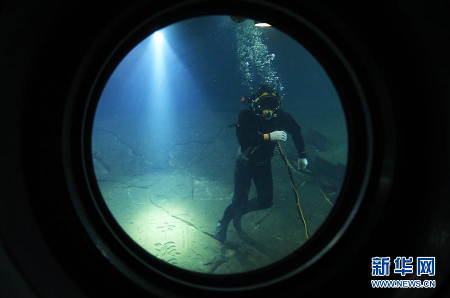 3月15日,在長江水下40多米的白鶴梁題刻無壓容器罩內(nèi),潛水員在進行清理作業(yè)。新華社記者 王全超 攝