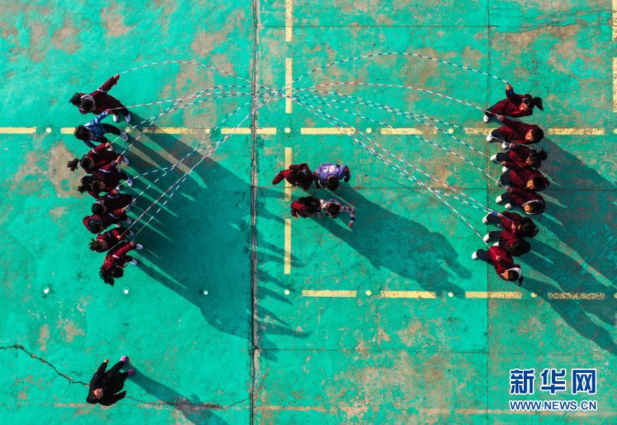 騎路小學(xué)的學(xué)生們?cè)诖笳n間練習(xí)“大網(wǎng)繩跳”(3月10日攝,無(wú)人機(jī)照片)。新華社記者 楊磊 攝