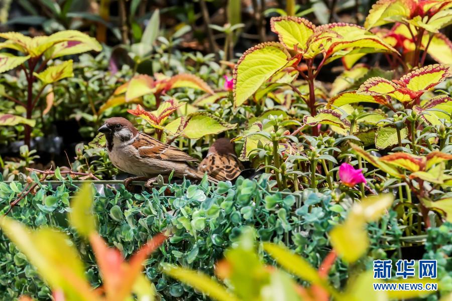 3月18日,在位于馬尼拉的菲律賓大學附屬菲律賓總醫(yī)院,兩只麻雀站在“低語的花床”藝術(shù)裝置上。