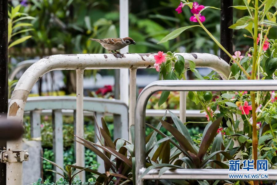 3月18日,在位于馬尼拉的菲律賓大學附屬菲律賓總醫(yī)院,一只麻雀站在“低語的花床”藝術(shù)裝置上。