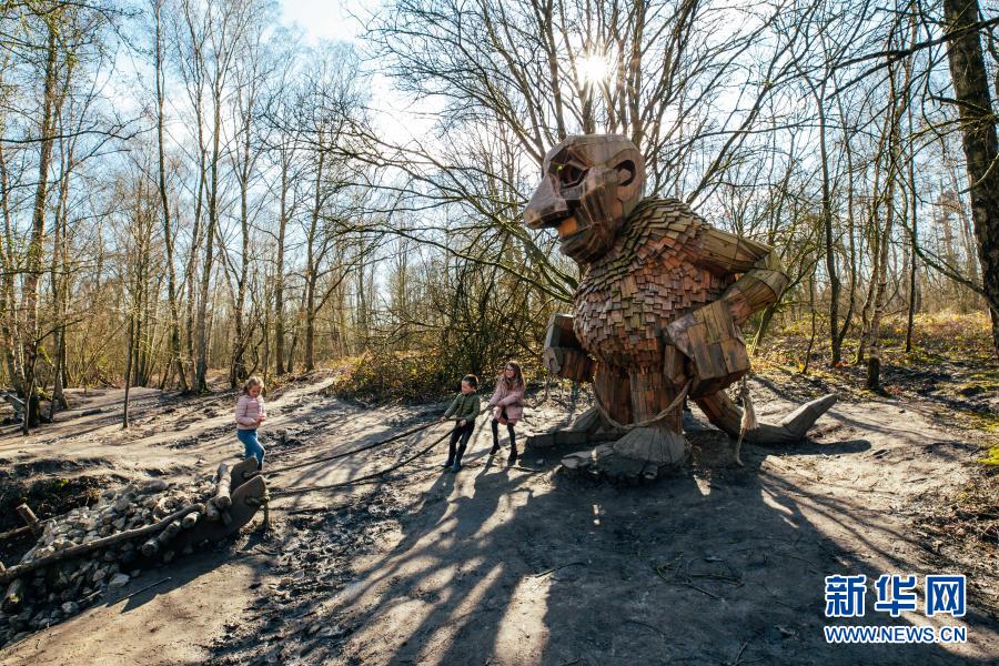3月20日,孩子們在比利時(shí)博姆市的德舒爾森林公園和一座“巨人”雕塑“玩?!?。新華社記者 張鋮 攝