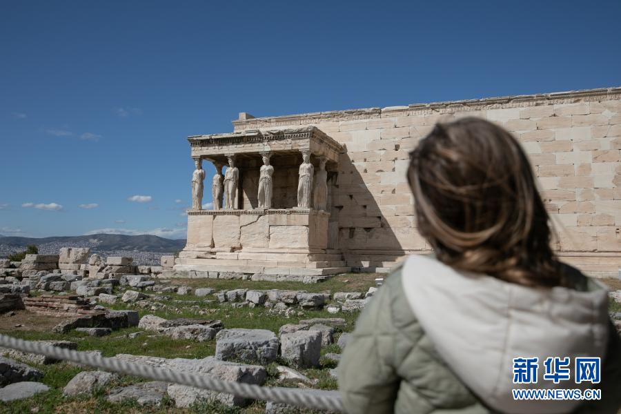 3月22日,一名游客游覽希臘雅典衛(wèi)城。希臘露天考古遺跡22日起恢復(fù)開放。游客需遵守保持社交距離和佩戴口罩等防疫規(guī)定。新華社發(fā)(萊夫特里斯·帕察里斯攝)