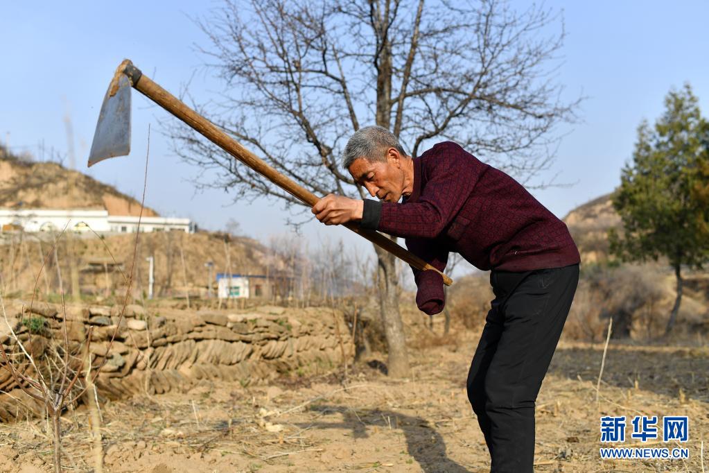 在山西省石樓縣鐵頭村,張尚保在地里干活(3月24日攝)。新華社記者 詹彥 攝