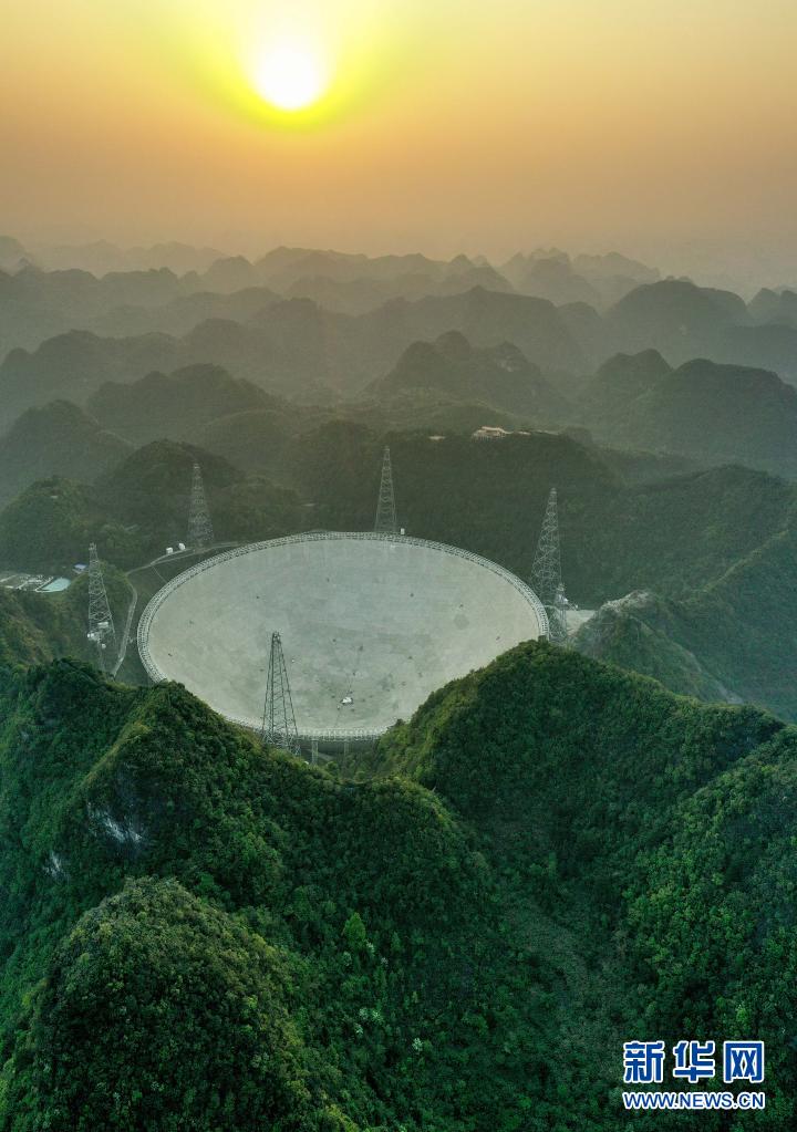 3月29日拍攝的晚霞中的“中國(guó)天眼”全景(維護(hù)保養(yǎng)期間拍攝,無人機(jī)照片)。