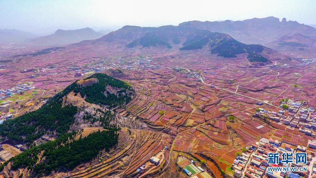 近日,位于山東省濟南市仲宮街道的大片桃園進入盛花期,漫山遍野的桃花在春風中爭相綻放。