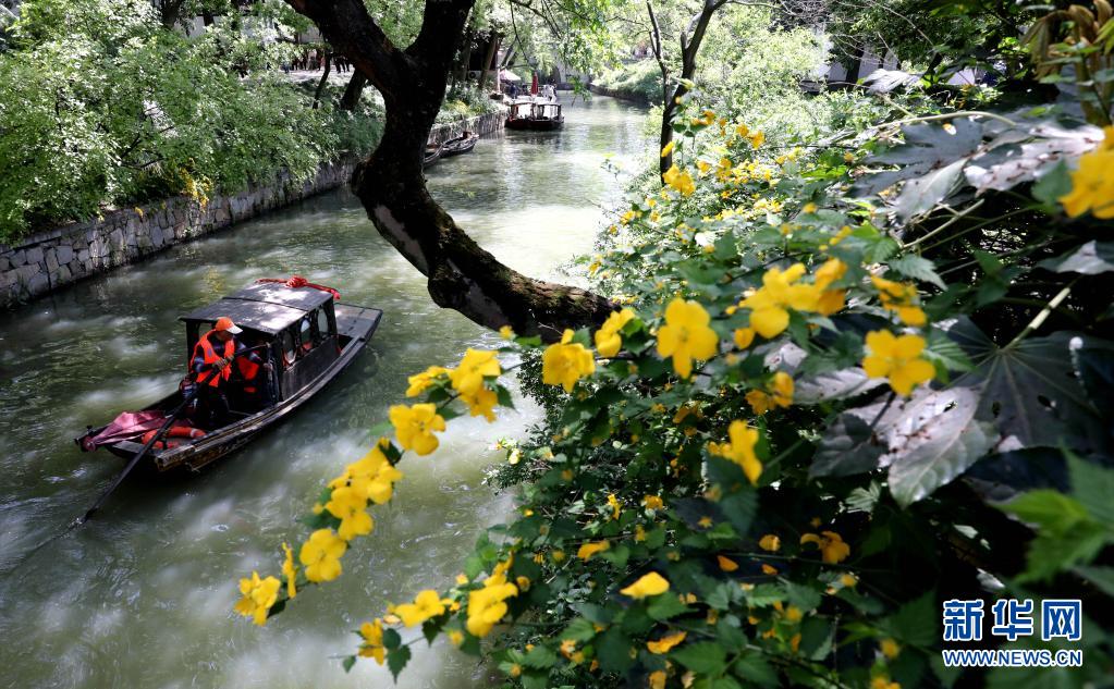4月5日,在江蘇蘇州虎丘景區(qū),游客坐在手搖小游船上賞春。