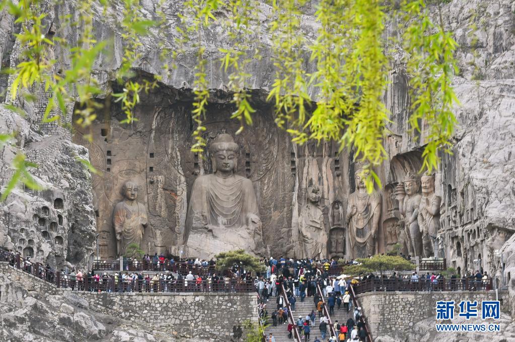 4月4日,游客在位于河南洛陽(yáng)的龍門石窟景區(qū)內(nèi)參觀游覽。