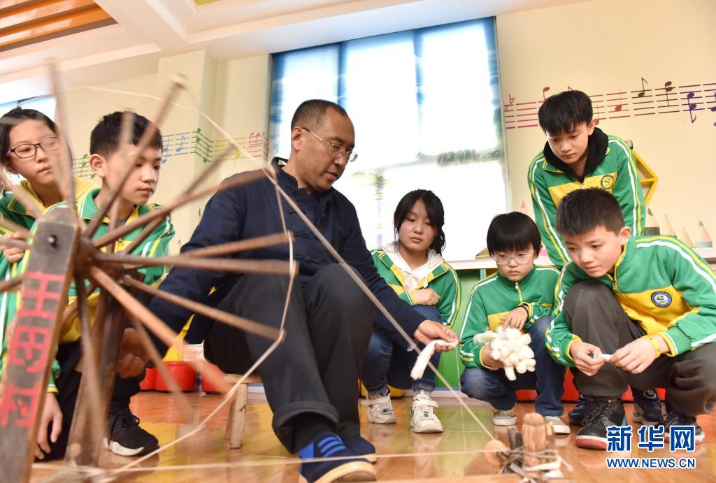 4月7日,威縣土布紡織技藝傳承人高慶海在威縣第四小學(xué)向?qū)W生演示老粗布紡織技藝。近年來(lái),河北省邢臺(tái)市威縣積極開(kāi)展“非遺傳承進(jìn)校園”活動(dòng),將當(dāng)?shù)靥厣沁z項(xiàng)目引入學(xué)校課堂,讓學(xué)生近距離感受民間傳統(tǒng)技藝的魅力,促進(jìn)非遺文化的保護(hù)和傳承。新華社記者 朱旭東 攝
