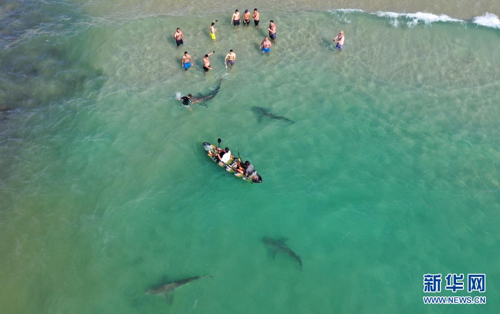 4月20日,在以色列北部城市哈代拉的海邊,鯊魚從人們身邊游過(無人機照片)。