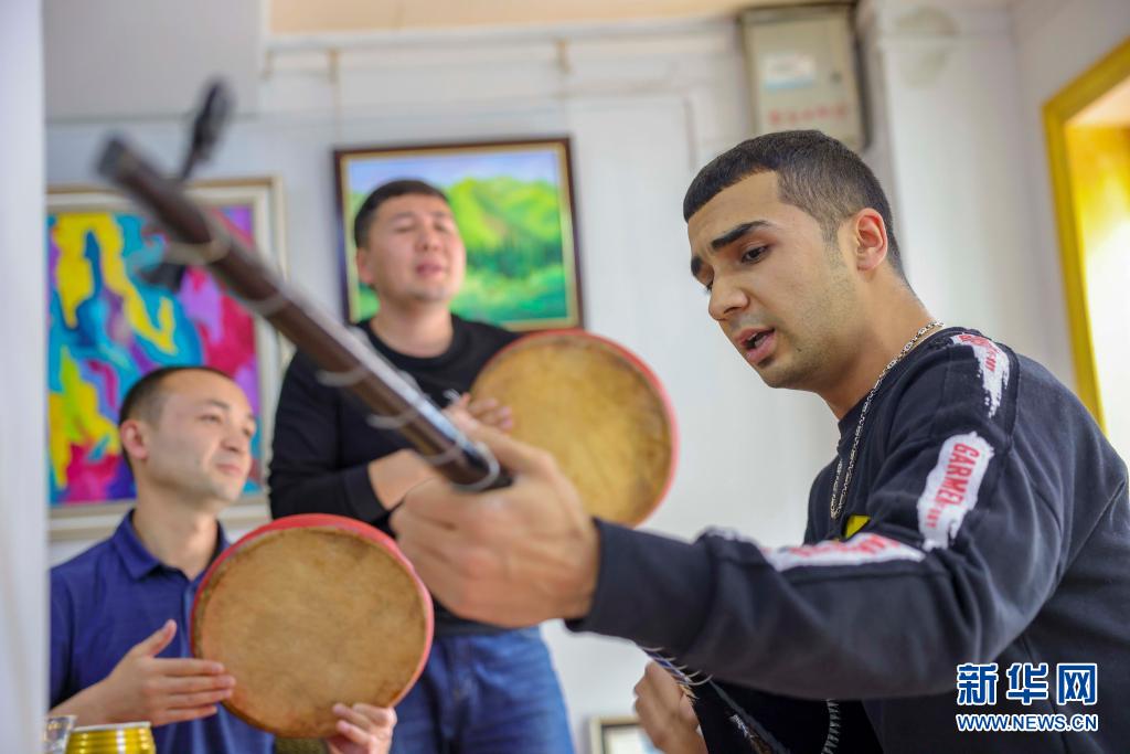 麥麥提吐爾遜江·麥麥提依明(右)在工作室內(nèi)和朋友唱歌(5月5日攝)。新華社記者 胡虎虎 攝