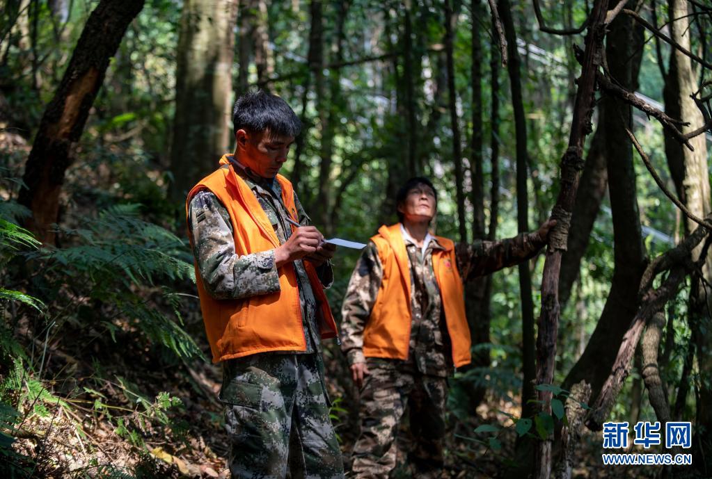 護(hù)林員楊有山(左)在林間記錄天行長臂猿家庭的活動(dòng)情況(3月15日攝)。