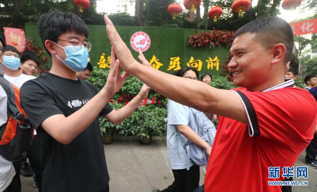 6月9日,在湖南省婁底市第二中學考點,走出考場的老大李慶國和班主任宋老師擊掌。