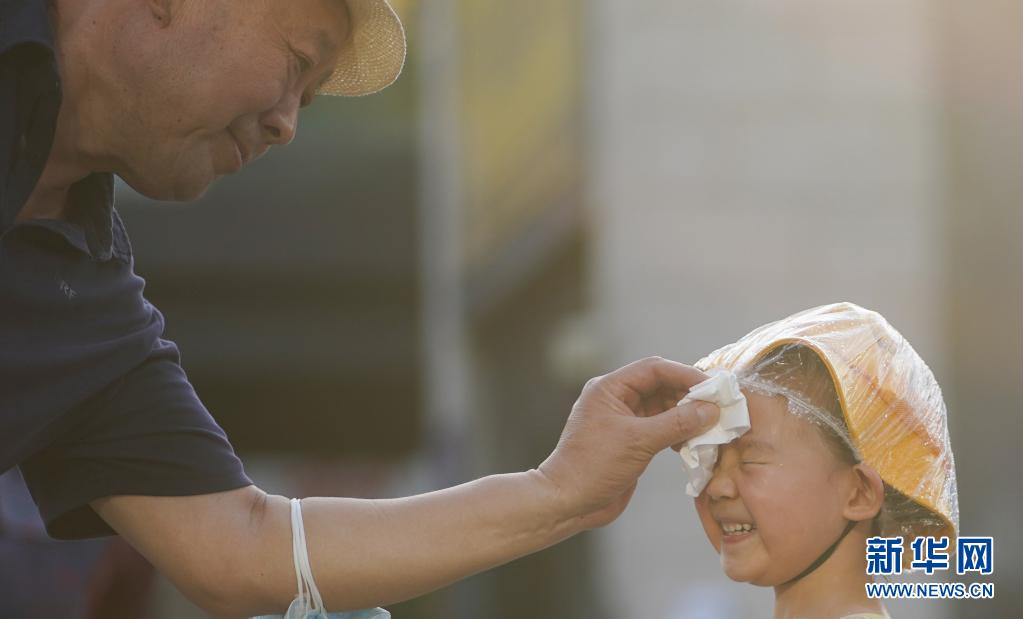 6月20日,在北京華熙LIVE·五棵松商業(yè)街區(qū)一處噴泉旁,家長擦干小朋友臉上的水。