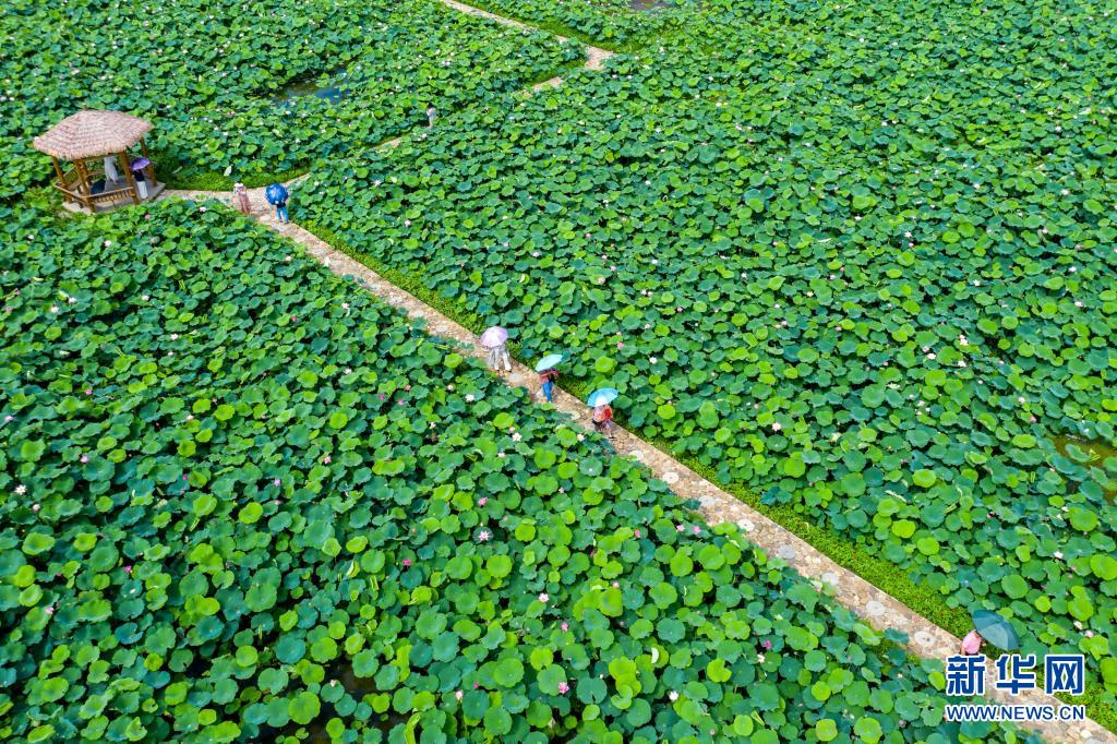 6月21日,在浙江省湖州市長興縣李家巷鎮(zhèn)石泉村歷史文化古村落,游客賞荷游玩(無人機(jī)照片)。