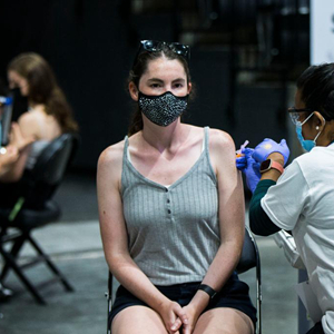 6月27日,在加拿大多倫多,人們?cè)诖笮托鹿谝呙缃臃N中心接種疫苗。