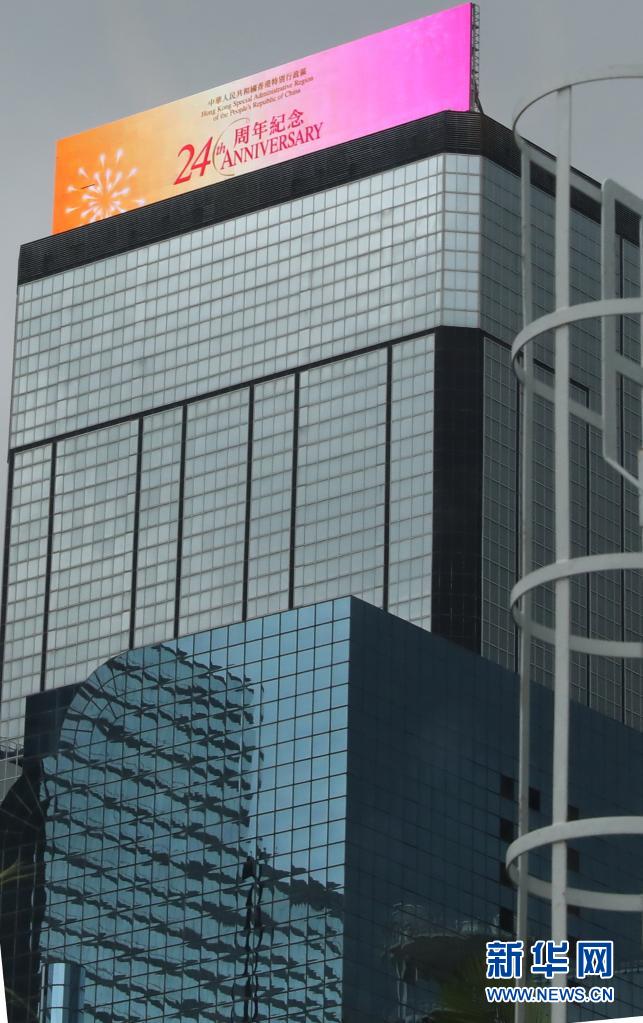 香港街頭建筑物上電子屏顯示的標語(6月29日攝)。