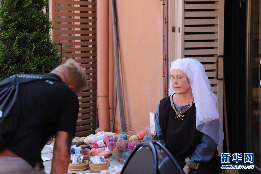 7月1日,一名身著中世紀(jì)風(fēng)格服裝的攤主在芬蘭圖爾庫舉行的“中世紀(jì)市集”上向顧客售賣紀(jì)念品。