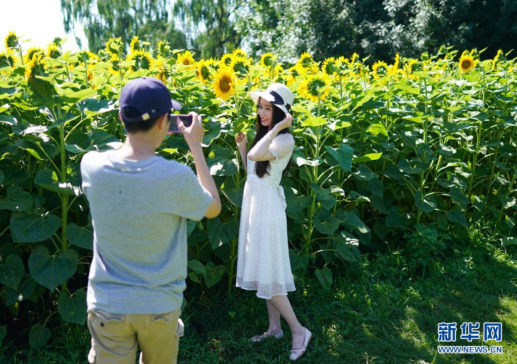 7月4日,游客在北京奧林匹克森林公園北園的向日葵花田旁拍照。