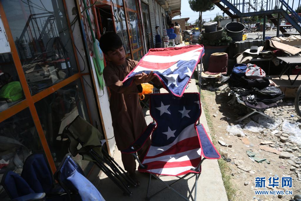 7月3日,在阿富汗帕爾萬省的巴格拉姆空軍基地附近,當(dāng)?shù)鼐用裨诿儡娺z留下的物品中回收廢舊物。