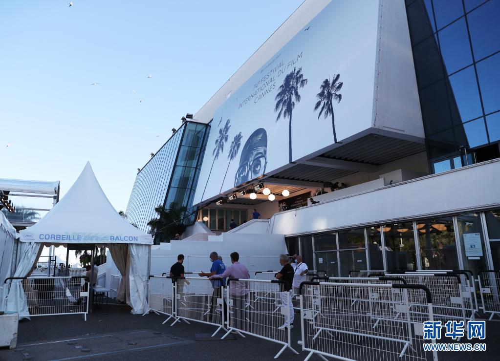 7月5日,工作人員在法國戛納的電影宮外為開幕式做準(zhǔn)備。