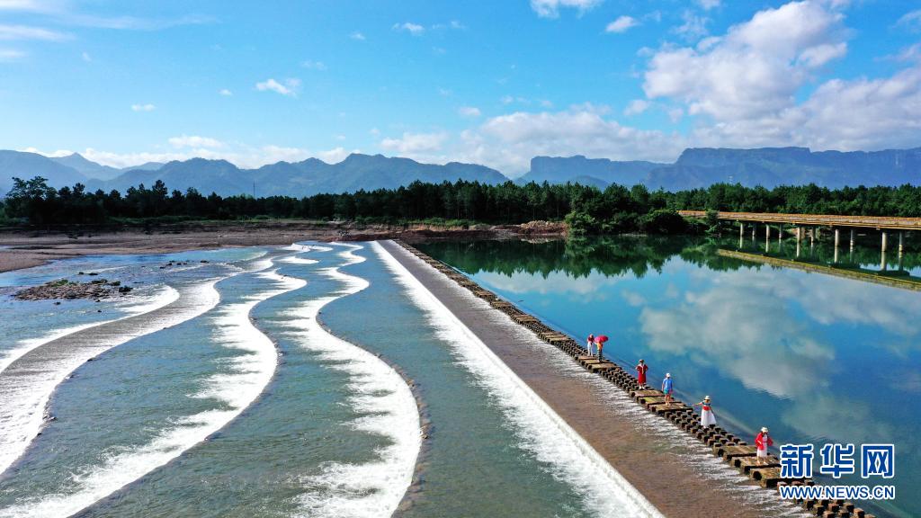 當(dāng)日,浙江省臺(tái)州市仙居縣永安溪流域水面如鏡,藍(lán)天、白云倒影水中,構(gòu)成一幅美麗的畫(huà)卷。新華社發(fā)(王華斌 攝)