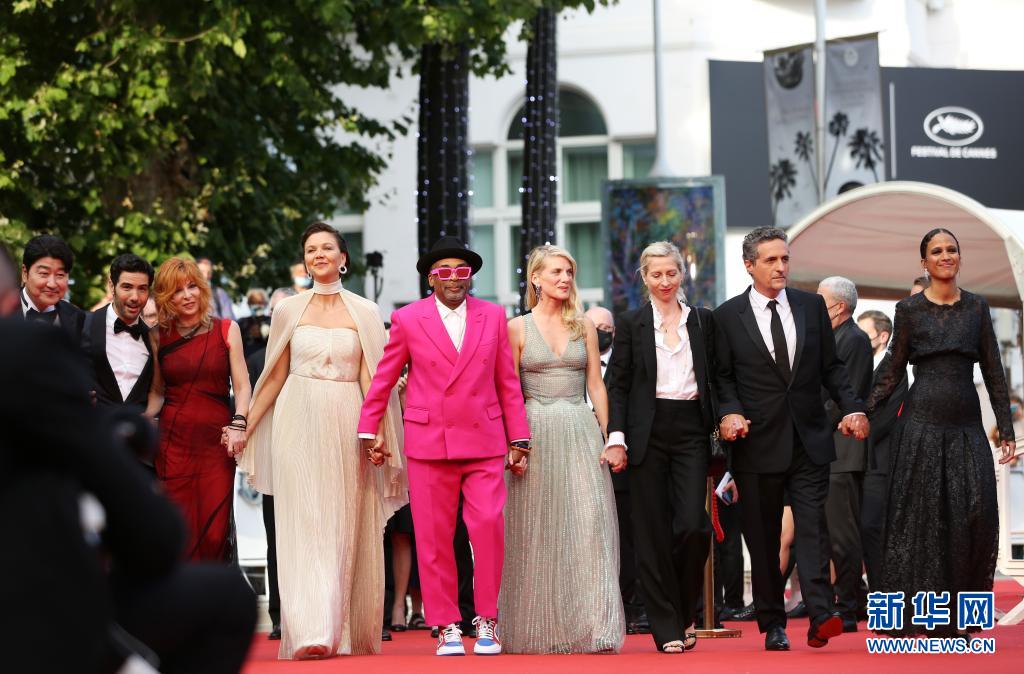 7月6日,第74屆法國戛納國際電影節(jié)主競賽單元評委會主席、美國導(dǎo)演和制片人斯派克·李(中)攜主競賽單元評委出席開幕式紅毯。