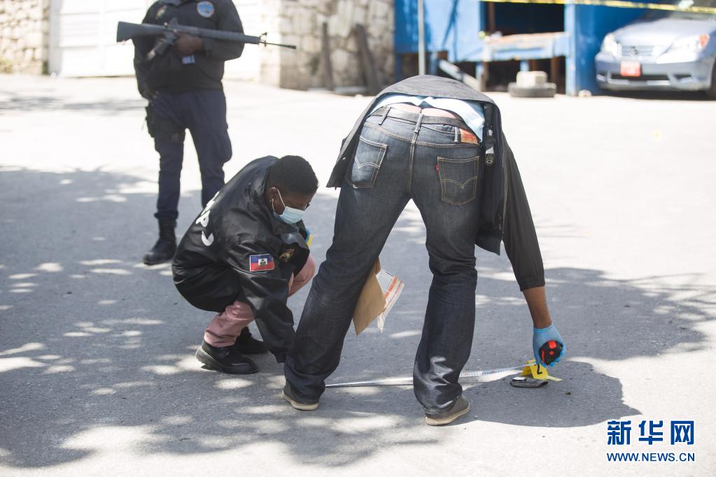 7月7日,在海地太子港,工作人員在海地總統(tǒng)莫伊茲的住所旁開展調(diào)查。