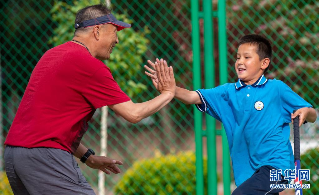 塔城市第二小學(xué)曲棍球隊(duì)的小隊(duì)員加熱斯·努爾白拉提(右)與教練杜寶柱擊掌慶祝進(jìn)球(6月11日攝)。