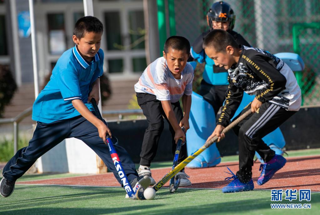 塔城市第二小學(xué)曲棍球隊(duì)員加熱斯·努爾白拉提(前左)、申世豪(前中)與哈爾肯·夏里甫在隊(duì)內(nèi)訓(xùn)練賽中拼搶?zhuān)?月11日攝)。