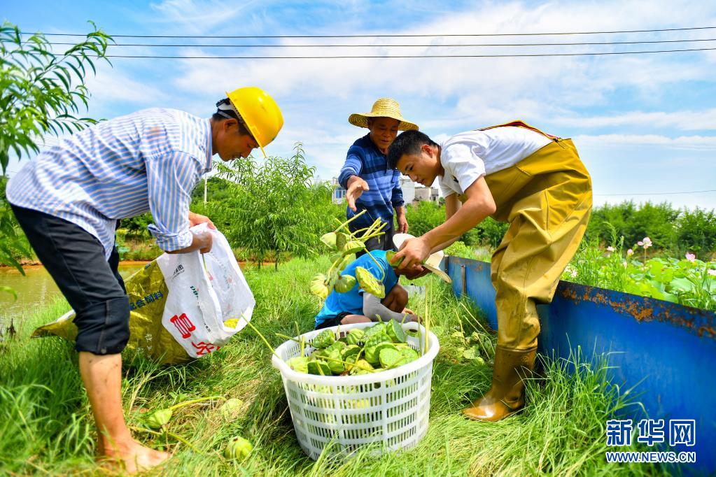 7月11日,在湖南省湘潭市雨湖區(qū)姜畬鎮(zhèn)聯(lián)映村,蓮農(nóng)將采摘好的蓮蓬裝筐。新華社記者 陳澤國 攝