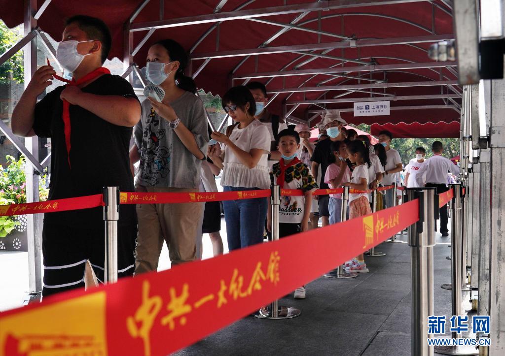 7月11日,觀眾在中共一大紀(jì)念館前的遮陽棚下排隊(duì)等待參觀。