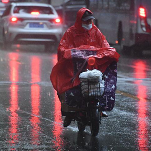 7月12日, 在北京市海淀區(qū)中關村街道科學院南路,市民在雨中騎行。