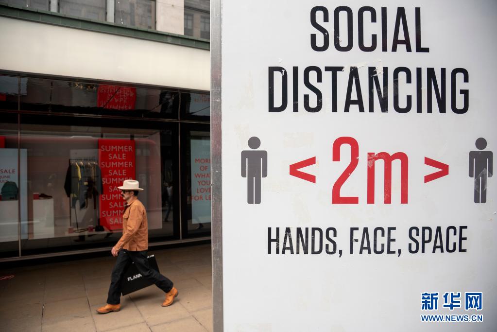 7月12日,在英國(guó)倫敦,一名男子從提示人們保持社交距離的牌子旁走過(guò)。