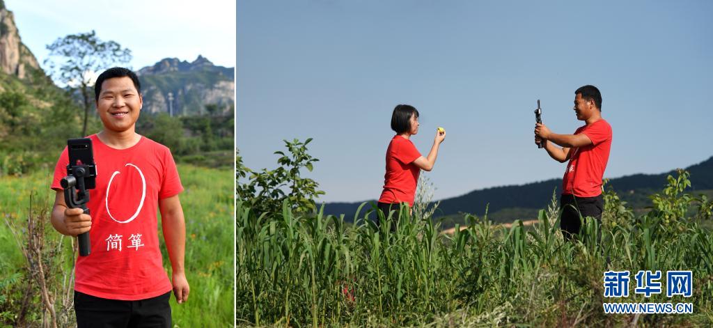拼版照片:左圖為劉瑞旭拿著手機(jī)穩(wěn)定器;右圖為在山西省黎城縣巖井村,劉瑞旭(右)和合作社同事在谷子地里直播(7月8日攝)。今年29歲的劉瑞旭開(kāi)過(guò)飯店、賣(mài)過(guò)房子、種過(guò)果樹(shù),2019年回到老家平順縣榔樹(shù)園村做起了職業(yè)農(nóng)民,成為太行山上的“新農(nóng)人”。回村后,劉瑞旭和合作社的同事抓住網(wǎng)絡(luò)直播帶貨的熱潮,嘗試田間地頭直播。借助網(wǎng)絡(luò)的力量,合作社的小米搭上了“互聯(lián)網(wǎng)+”快車(chē)銷(xiāo)往全國(guó)各地。