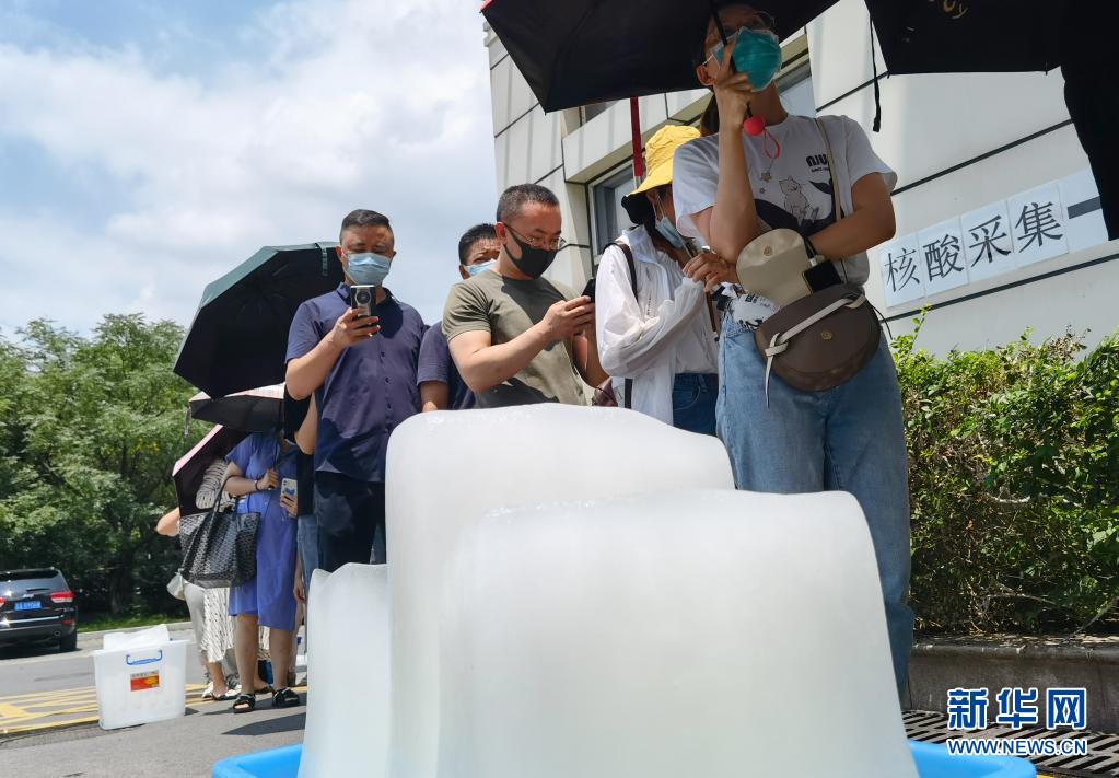 7月22日,在南京市第一醫(yī)院河西院區(qū)核酸檢測(cè)點(diǎn),等待核酸檢測(cè)的隊(duì)伍旁擺上了大冰塊。