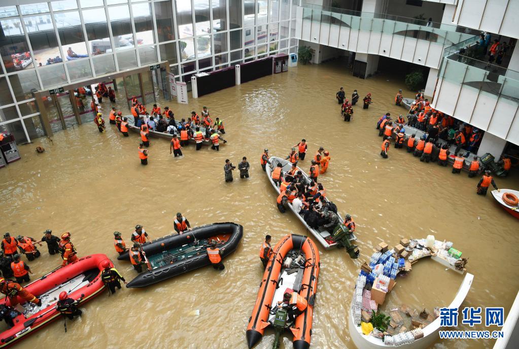 7月22日,在阜外華中心血管病醫(yī)院門診部,救援人員在積水的大廳內(nèi)駕駛舟艇轉(zhuǎn)移病患。