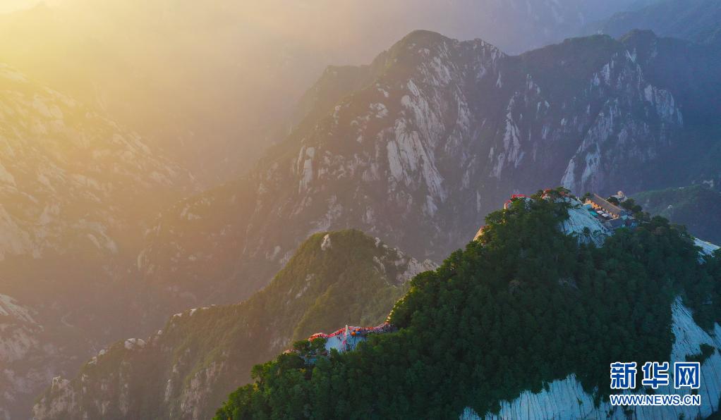 晨曦初露,位于陜西省渭南市的華山景區(qū)沐浴在霞光之中,景色壯美。