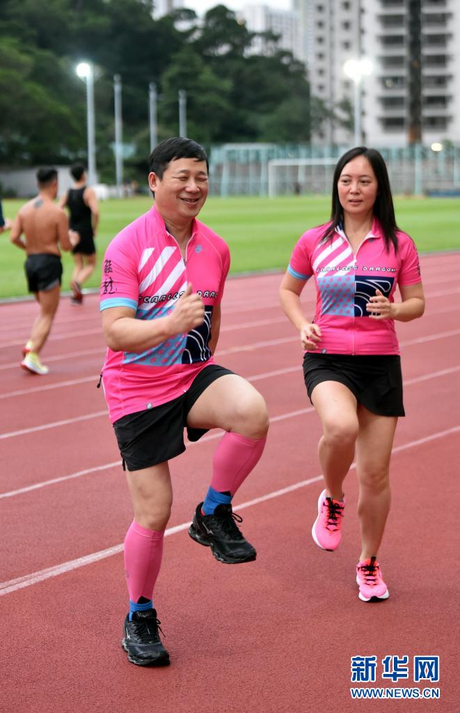 猛龍長跑隊創(chuàng)辦人莫儉榮(左)與領(lǐng)跑員嚴惠茵訓練前進行熱身(7月29日攝)。