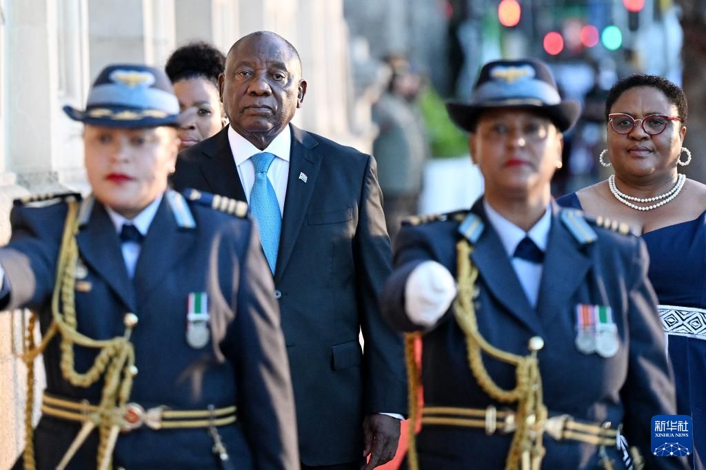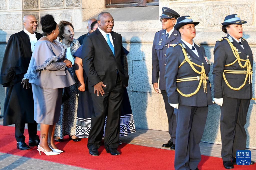 2月12日,在南非开普敦,南非总统拉马福萨(右四)抵达开普敦市政厅。