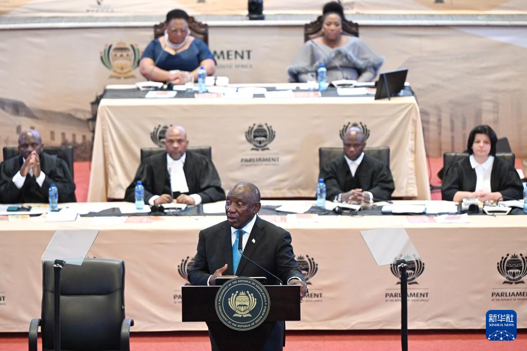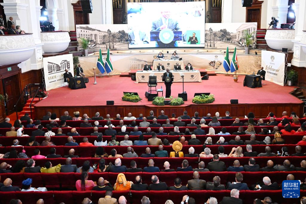 2月12日,在南非开普敦,南非总统拉马福萨在开普敦市政厅发表国情咨文讲话。